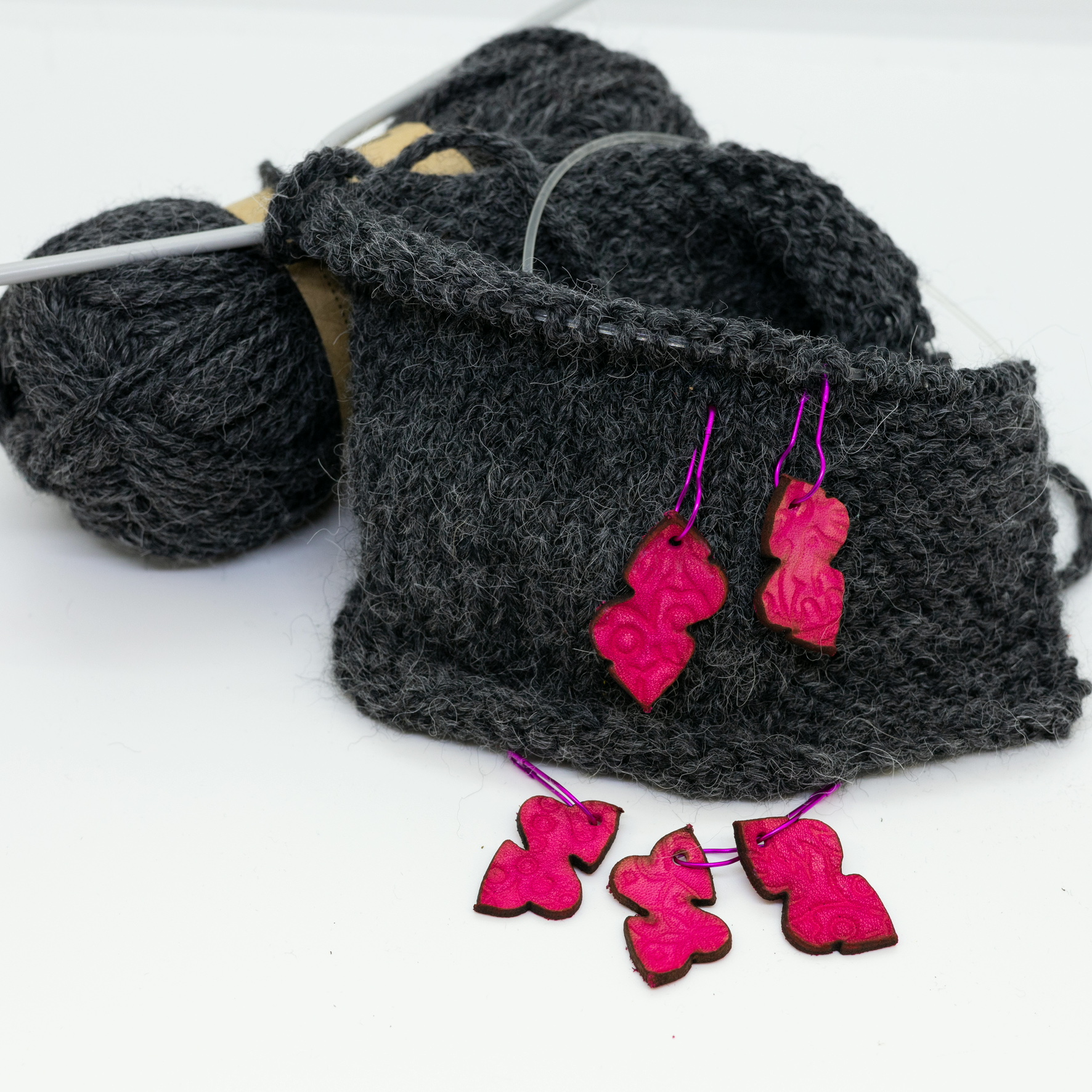Nahkaiset silmukkamerkit ovat kevyitä ja hakaneulan ansiosta helppoja siirtää haluttuun paikkaan. Setissä on viiden kappaleen setti silmukkamerkkejä.
