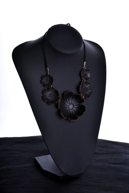 Nahkainen kaulakääty on käsin muotoiltu ja hyvin kevyt. Materiaali on värjäämätöntä kasviparkittua nahkaa. Osat muotoillaan yksitellen käsin ja värit sekoitetaan pigmenteistä joka maalauskerta erikseen, jokainen koru on siis ainutlaatuinen. Kaikki metalliosat ovat nikkelittömiä. Säädettävä nauha on iholla miellyttävältä tuntuvaa samettia. Suurimman kukan halkaisija on n. 75mm. Voit käyttää korua monella eri tavalla; pukea sen juuri oikealle korkeudelle kaulaasi, kiepauttaa pannaksi hiuksiin tai otsalle, ranteessa, nilkassa... Keveytensä ansiosta House of Simone nahkakorua voivat käyttää myös useimmat tuntoyliherkät henkilöt.