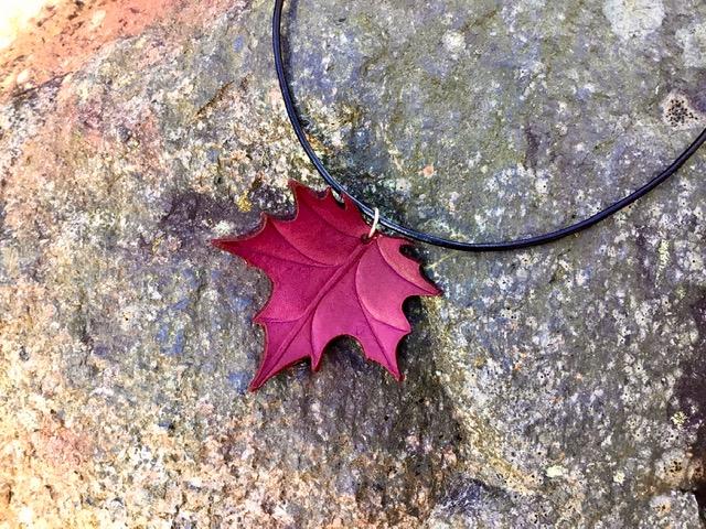 Kasviparkitusta nahasta käsin muotoiltu vaahteranlehti jonka muoto on saanut inspiraationsa aidosta vaahteranlehdestä, väreissä hehkuu ruska. Hyvin kevyt, lehden korkeus n. 5cm. Papukaijalukolla ja säädöllä varustetulla nahkanyörillä. Metalliosat allergisoimatonta kirurginterästä.