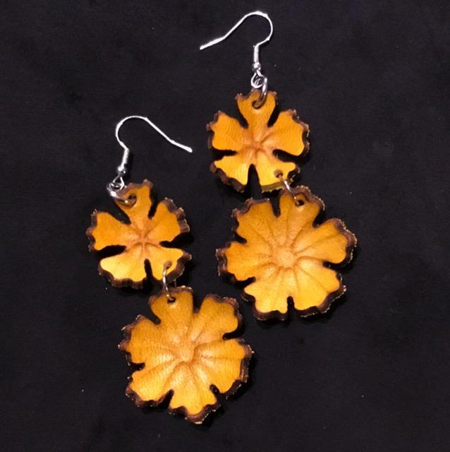Kasviparkitusta nahasta käsin muotoillut kukkakorvikset, muoto on saanut inspiraationsa puutarhan kukkaloistosta. Jokainen kukka on niin muodoltaan kuin sävyltäänkin uniikki, myös värit sekoitetaan pigmenteistä joka maalauskerta, joten korusi saattaa poiketa hiukan kuvan korusta. Hyvin kevyet, kokonaiskorkeus koukun kanssa n. 7cm Metalliosat allergisoimatonta kirurginterästä.