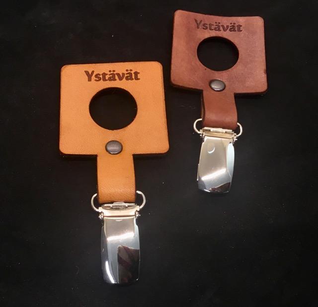 Materiaali on napakkaa kasviparkittua naudannahkaa, käsin värjätty. Lev 4,5cm, nahkaosan korkeus 6cm Reiän halkaisija 2cm Kokonaiskorkeus klipsin kanssa 9,5cm