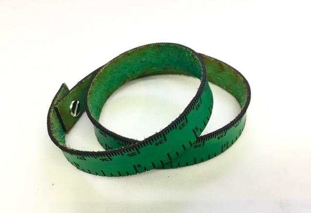 Kaksi pituutta: 39cm ja 42cm, leveys 1,5cm. Toisella laidalla senttimetrit ja toisella tuumat.