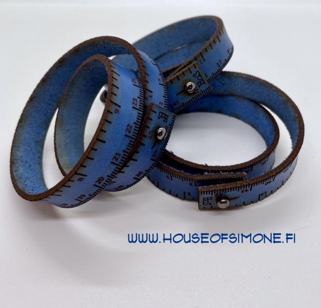 Mittanauha, joka on aina mukana ja näyttää hyvältä! Käsitöitä harrastavalle. Lahjaksi. Ihan kelle vaan! Materiaali on kestävää ja käytössä kauniisti patinoituvaa kasviparkittua naudan vuotaa. Mittakuvio on leikattu laserilla tarkaksi ja värit sekoitetaan pigmenteistä joka maalauskerta, joten pieniä sävyeroja saattaa löytyä. Viimeistelty nahan hoitoaineella ja kiinnitys ruuvinastalla. Leveys 1,5cm. Toisella laidalla senttimetrit ja toisella tuumat. Valmistettu käsityönä Kangasalla.