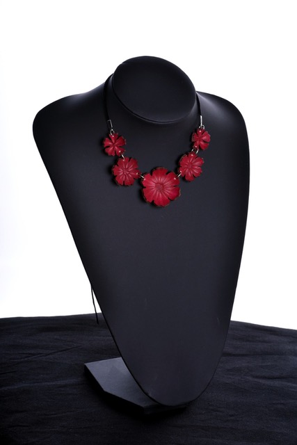 Nahkainen kaulakääty on käsin muotoiltu ja hyvin kevyt. Materiaali on värjäämätöntä kasviparkittua nahkaa. Osat muotoillaan yksitellen käsin ja värit sekoitetaan pigmenteistä joka maalauskerta erikseen, jokainen koru on siis ainutlaatuinen. Kaikki metalliosat ovat nikkelittömiä. Säädettävä nauha on iholla miellyttävältä tuntuvaa samettia. Suurimman kukan halkaisija on noin 35mm. Voit käyttää korua monella eri tavalla; pukea sen juuri oikealle korkeudelle kaulaasi, kiepauttaa pannaksi hiuksiin tai otsalle, ranteessa, nilkassa...
