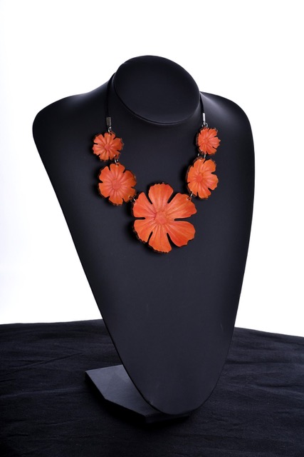 Nahkainen kaulakääty on käsin muotoiltu ja hyvin kevyt. Materiaali on värjäämätöntä kasviparkittua nahkaa. Osat muotoillaan yksitellen käsin ja värit sekoitetaan pigmenteistä joka maalauskerta erikseen, jokainen koru on siis ainutlaatuinen. Kaikki metalliosat ovat nikkelittömiä. Säädettävä nauha on iholla miellyttävältä tuntuvaa samettia. Suurimman kukan halkaisija on n. 75mm. Voit käyttää korua monella eri tavalla; pukea sen juuri oikealle korkeudelle kaulaasi, kiepauttaa pannaksi hiuksiin tai otsalle, ranteessa, nilkassa... Keveytensä ansiosta House of Simone nahkakorua voivat käyttää myös useimmat tuntoyliherkät henkilöt.