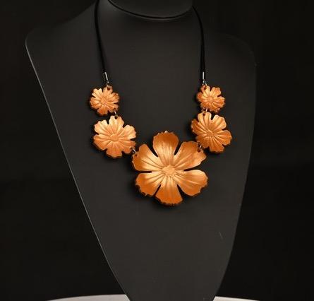 Nahkainen kaulakääty on käsin muotoiltu ja hyvin kevyt. Materiaali on värjäämätöntä kasviparkittua nahkaa. Osat muotoillaan yksitellen käsin ja värit sekoitetaan pigmenteistä joka maalauskerta erikseen, jokainen koru on siis ainutlaatuinen. Kaikki metalliosat ovat nikkelittömiä. Säädettävä nauha on iholla miellyttävältä tuntuvaa samettia. Suurimman kukan halkaisija on n. 75mm. Voit käyttää korua monella eri tavalla; pukea sen juuri oikealle korkeudelle kaulaasi, kiepauttaa pannaksi hiuksiin tai otsalle, ranteessa, nilkassa... Keveytensä ansiosta House of Simone nahkakorua voivat käyttää myös useimmat tuntoyliherkät henkilöt.