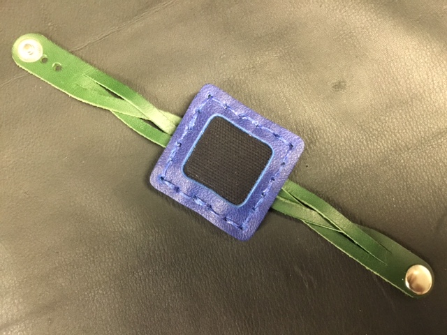 Sopii ranteelle, jonka ympärysmitta on max. 18cm. Tyynyn koko 4 x 4cm Käsin leikattu, punottu ja ommeltu aidosta nahasta, nepparikiinnitys. Tyynyn päällinen puuvillakangas (ompelimon leikkuujäte) ja täyte joko merinoneulos (leikkuujäte) tai lampaanvilla (ylijäämä)