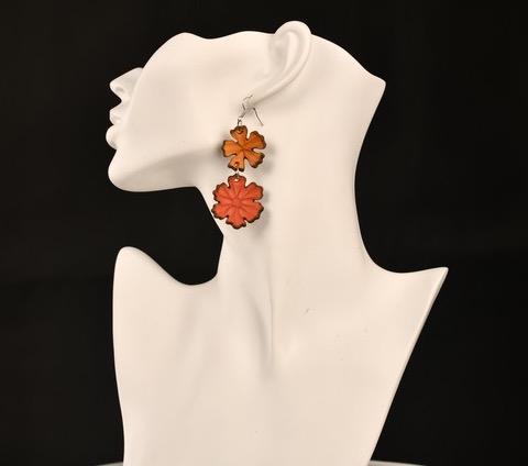 Kasviparkitusta nahasta käsin muotoillut kukkakorvikset, muoto on saanut inspiraationsa puutarhan kukkaloistosta. Hyvin kevyet, kokonaiskorkeus koukun kanssa n. 7cm Metalliosat allergisoimatonta kirurginterästä.