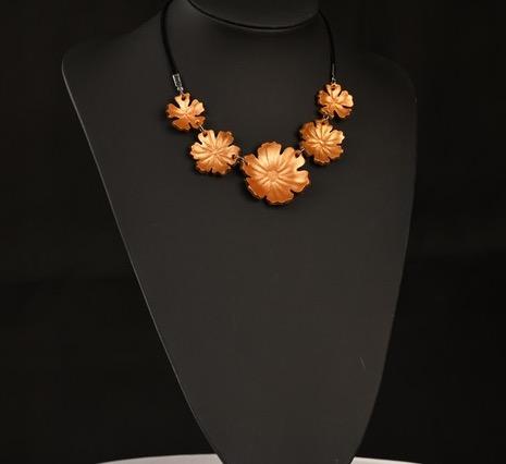 Nahkainen kaulakääty on käsin muotoiltu ja hyvin kevyt. Materiaali on värjäämätöntä kasviparkittua nahkaa. Osat muotoillaan yksitellen käsin ja värit sekoitetaan pigmenteistä joka maalauskerta erikseen, jokainen koru on siis ainutlaatuinen. Kaikki metalliosat ovat nikkelittömiä. Säädettävä nauha on iholla miellyttävältä tuntuvaa samettia. Suurimman kukan halkaisija on noin 35mm. Voit käyttää korua monella eri tavalla; pukea sen juuri oikealle korkeudelle kaulaasi, kiepauttaa pannaksi hiuksiin tai otsalle, ranteessa, nilkassa...