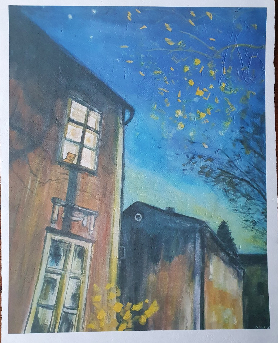 Mustesuihkutulostimella printti itse tehdylle paperille. Koko 19,7cm * 24,5cm. Alkuperäinen on Aija Saukkosen maalaus.