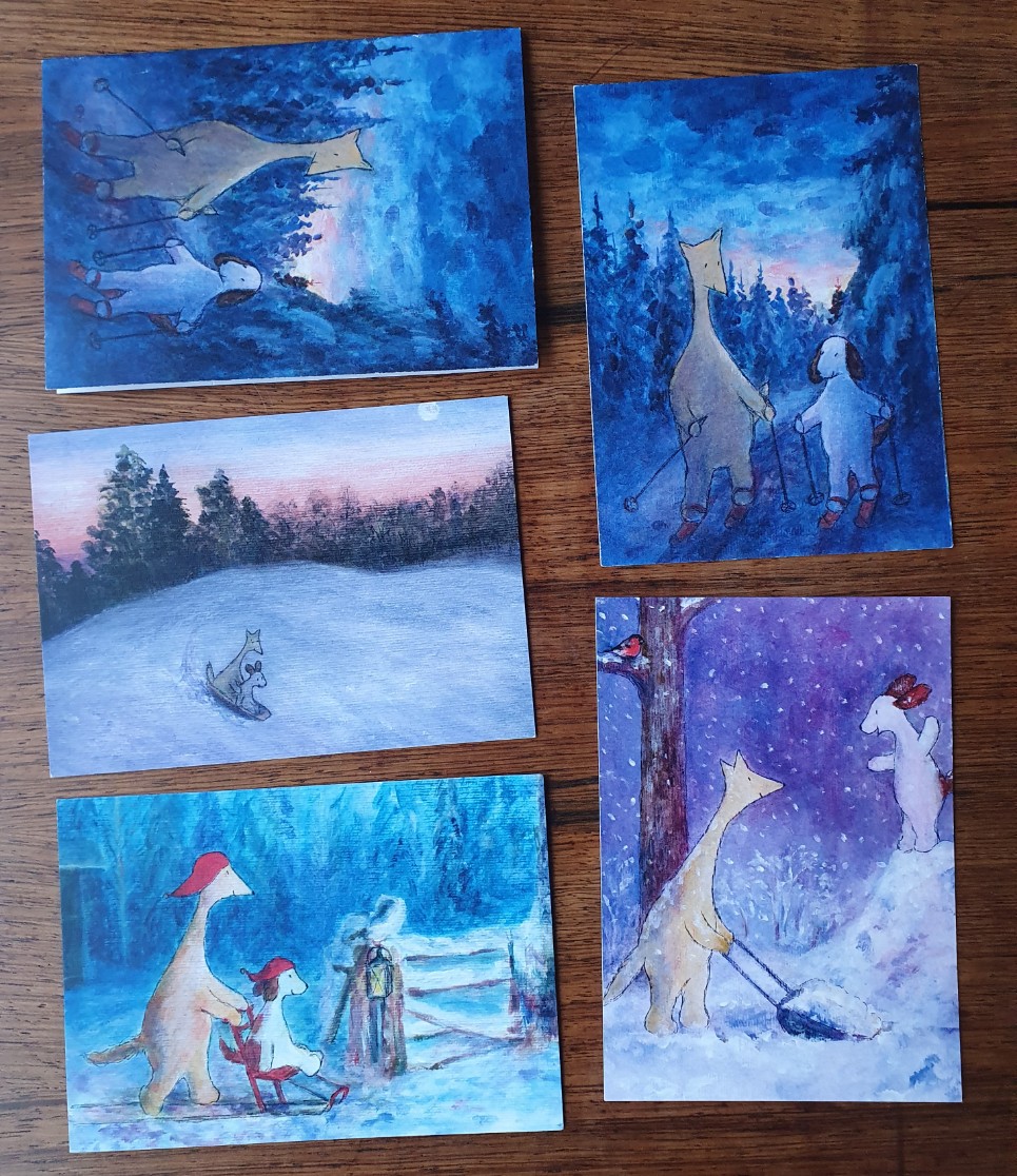 4 simple Hulmu & Haukku postcards and 1 folded card from year 2025. Printed and designed in Finland, size A6. There are no ready-made greeting messages. On the back side there are address bars (except the folded postcard). Paperboard: Nautilus Classic 300g/m2, 100% recycled paper.