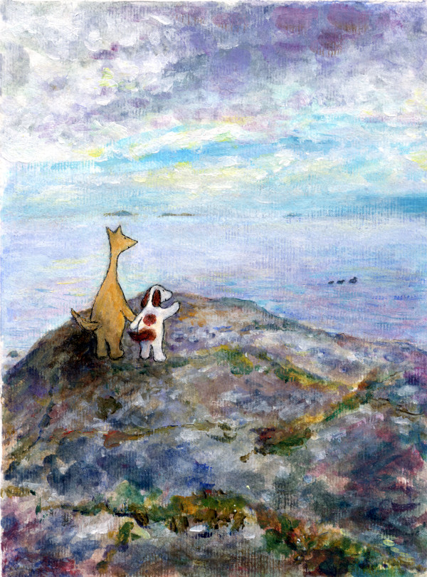 A4-kokoinen juliste. Hulmu ja Haukku katselevat merelle rantakalliolla.
