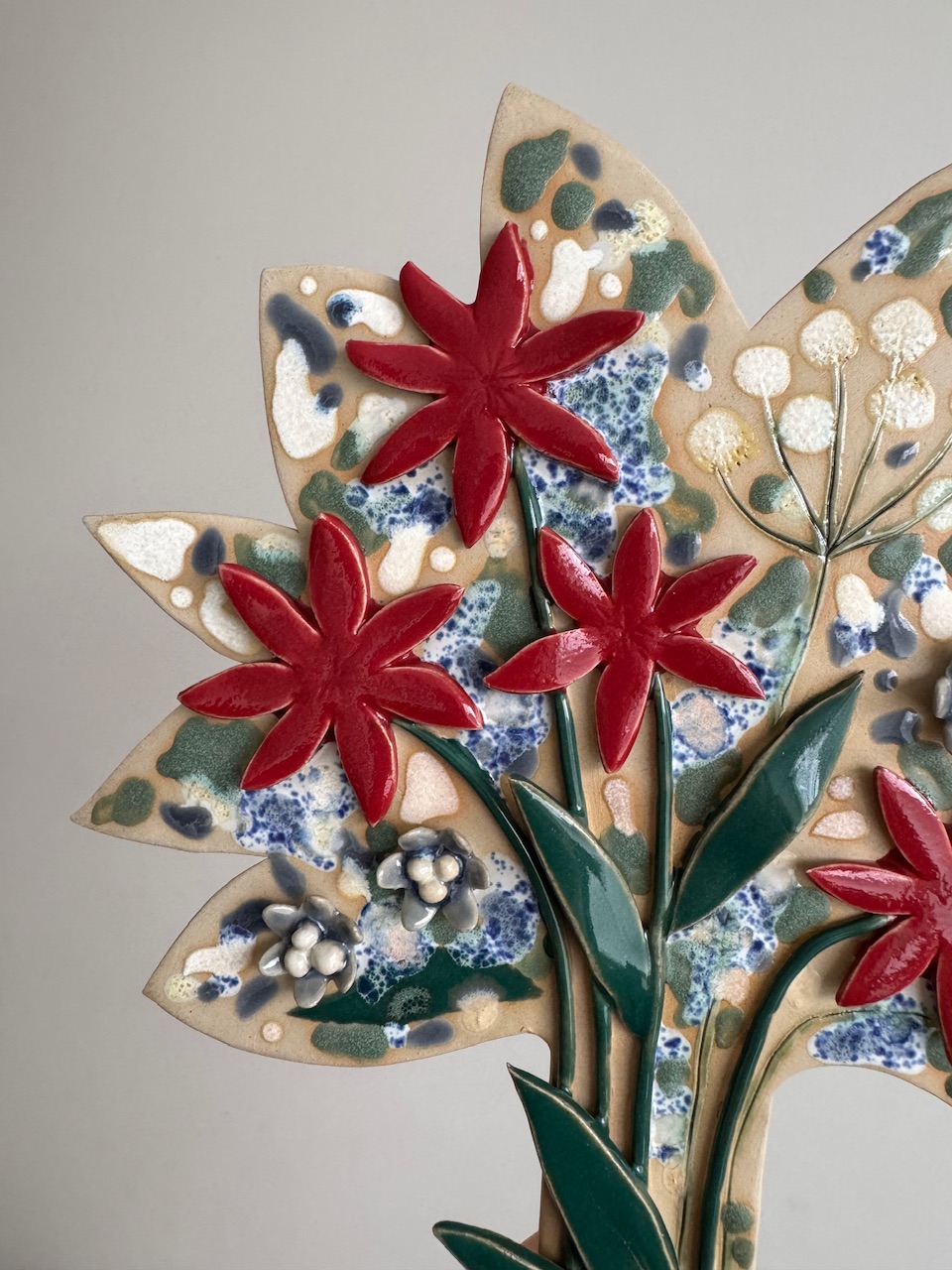 Veistos/seinäreliefi, 35 x 25cm, keramiikka, lasite.