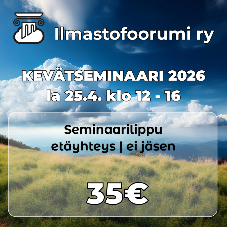 Osta tämä lippu, jos haluat osallistua Kevätseminaariin etäyhteydellä, etkä ole Ilmastofoorumi ry:n jäsen. Osallistu Ilmastofoorumi ry:n Kevätseminaariin 5.4.2026! Seminaari järjestetään Helsingissä Iiris-keskuksessa. Katso seminaarin ohjelma ja saapumisohjeet sivuiltamme! Varmista paikkasi ostamalla lippu ennakkoon.