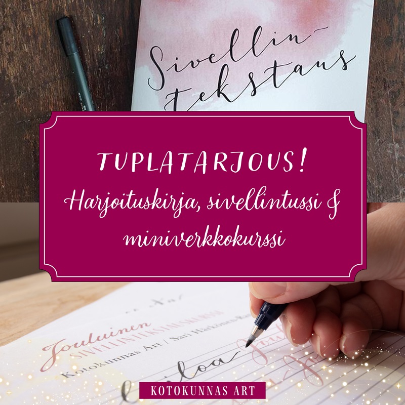 Tutustu sivellintekstaukseen ja hanki sivellintussi sekä harjoituskirja hyödyntämällä jouluista tuplatarjousta 52 euroa (norm. yht. 63,90 €)! Tarjous sisältää uuden ihanan Jouluinen sivellintekstaus -miniverkkokurssin (norm. 24,90) sekä Sivellintekstauksen aloituspaketin (norm. 39,00)