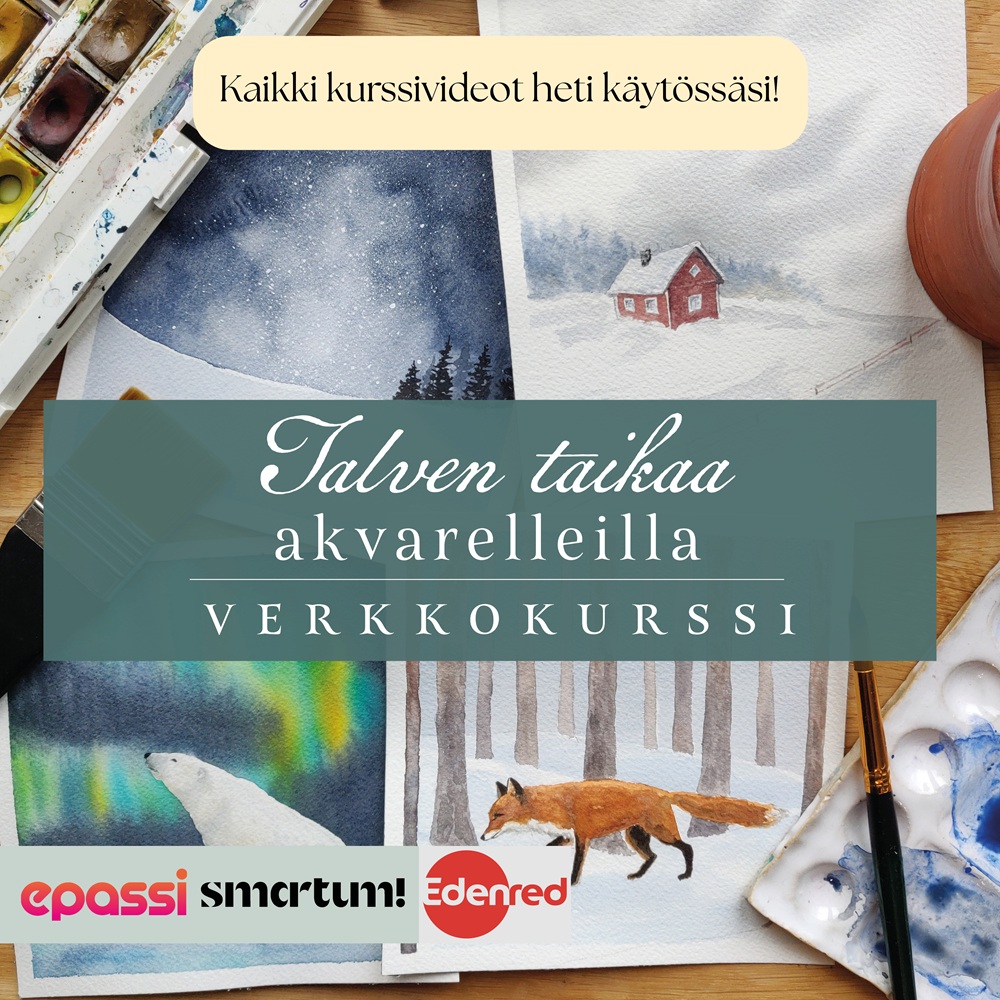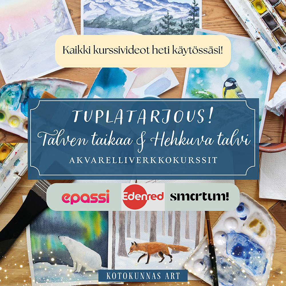 Tee syväsukellus taiteeseen ja hyödynnä tuplatarjous! Kaksi akvarelliverkkokurssia yhteishintaan 89 euroa (norm. yht. 118 €)! Tarjous sisältää suositun Talven taikaa akvarelleilla -verkkokurssin (norm. 69,00) sekä viime talven uuden suosikin Hehkuva talvi akvarelleilla -verkkokurssin (norm. 69,00)