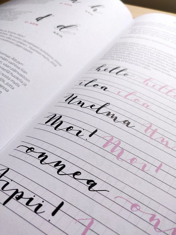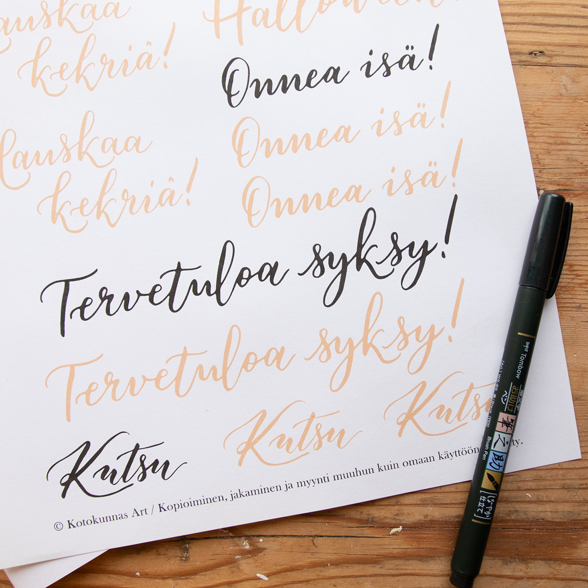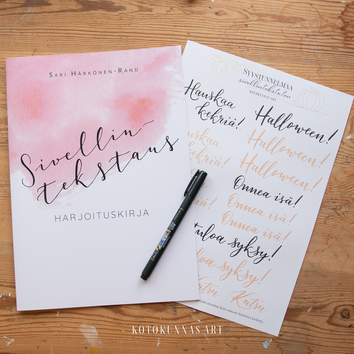 Olen viimeisten kuuden vuoden aikana opastanut sivellintekstauskursseillani satoja innokkaita kurssilaisia tämän hauskan taidon pariin. Vuonna 2020 julkaisin tämän harjoituskirjan, jonka avulla kauniin sivellintekstauksen taitoa voi harjoitella kotona tai vaikka laiturinnokassa. Asiakkaiden toiveesta harjoituskirja palaa nyt Kotokunnas Artin valikoimiin ja harjoitukset tämän syystäkin suositun taidon parissa jatkuvat.
