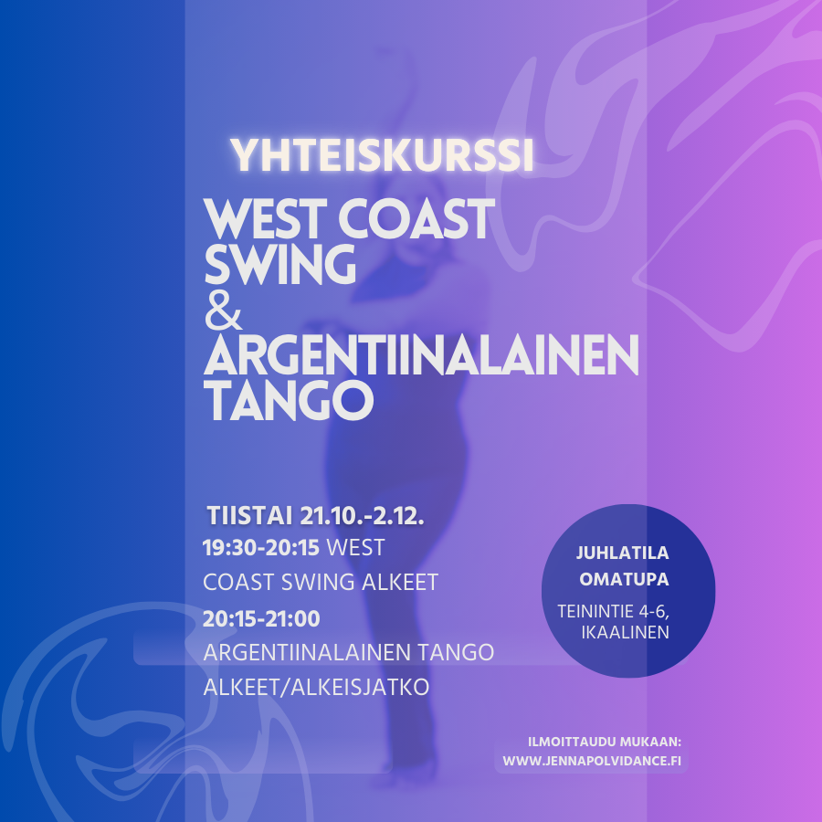 Yhden henkilön kurssimaksu molemmista kursseista (west coast swing + argentiinalainen tango) Tiistai klo 19:30-21 yht. 7 kurssikertaa 19:30-20:15 West Coast Swing 20:15-21:00 Argentiinalainen tango ti 21.10. ti 28.10. ti 4.11. ti 11.11. ti 18.11. ti 25.11. ti 2.12.