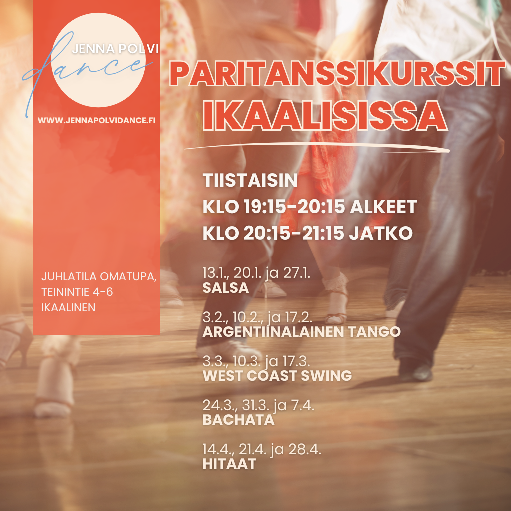 ⭐️ Paritanssikurssit Ikaalisissa ⭐️ ➡️ 3krt kurssi samaa lajia ➡️ Voit valita alkeet tai jatkotason kurssin ➡️ Ilmoittaudu parin kanssa tai ilman (pidämme huolen paritasapainosta) 🗓️ Aikataulu: Tiistai klo 19:15-20:15 taso ALKEET klo 20:15-21:15 taso JATKO 13.1., 20.1. ja 27.1. lajina SALSA 3.2., 10.2., ja 17.2. lajina ARGENTIINALAINEN TANGO 3.3., 10.3. ja 17.3. lajina WEST COAST SWING 24.3., 31.3. ja 7.4. lajina BACHATA 14.4., 21.4. ja 28.4. lajina HITAAT 🏠 Kurssipaikkka: Juhlatila Omatupa Teinintie 4-6, Ikaalinen ✍️ Voit ilmoittautua mukaan yhdelle tai useammalle kurssille. lmoittaudu mukaan täyttämällä lomake: https://forms.gle/Ci5eYNoGfJP3Vctb8. Voit ilmoittautua myös ilman paria. 💰 Hinnat: 1 x 3krt kurssi = 40€/hlö 2 x 3krt kurssi = 70€/hlö 3 x 3krt kurssi = 105€/hlö 4 x 3 krt kurssi = 140€/hlö 5 x 3 krt kurssi = 175€/hlö Kurssi maksetaan etukäteen verkkokaupassa viimeistään viikkoa ennen kurssin alkua: https://holvi.com/shop/jennapolvidance/. Jos haluat maksaa liikuntaeduilla, ota yhteyttä jenna.polvi@gmail.com. 📈 Muuta: Mukaan mahtuu sekä alkeis-, että jatkokursseille max. 10 paria. Opetus tapahtuu pienryhmässä yksilöllisesti. Ilmoittautuminen on sitova. Osallistujia ei ole vakuutettu järjestäjän toimesta. 🩷 Tervetuloa mukaan! www.jennapolvidance.fi