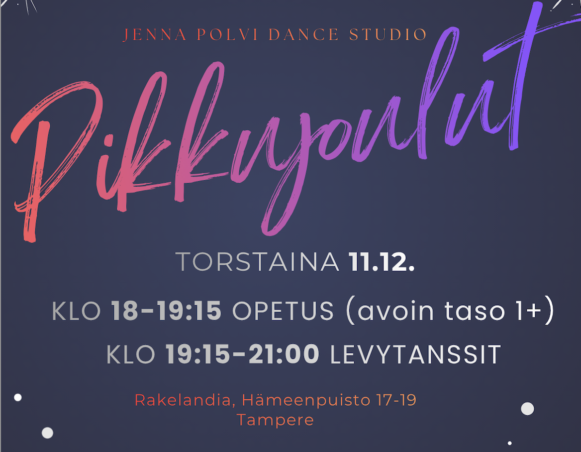 Jenna Polvi Dance Studion pikkujoulut 2025 torstaina 11.12.! Aikataulu: klo 18-19:15 Opetus (avoin taso, alkaen tasolta 1+) klo 19:15-21:00 Levytanssit