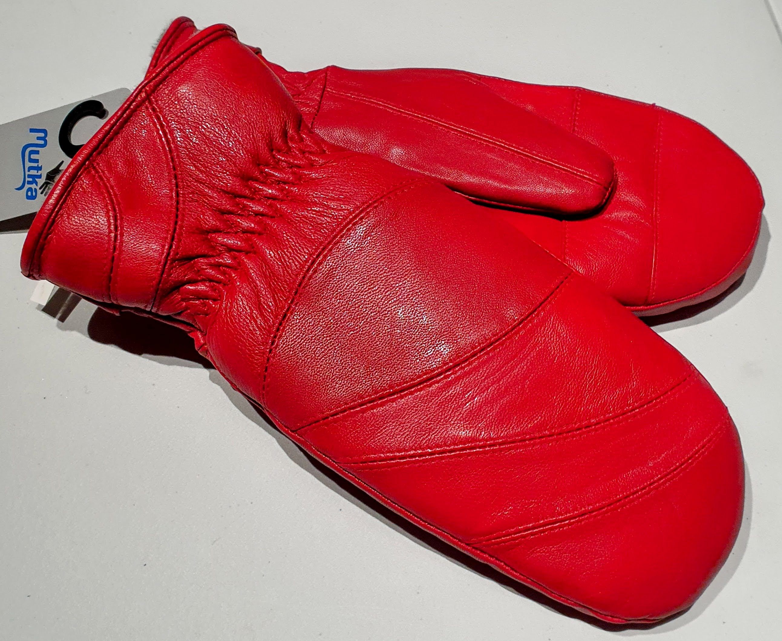 Erittäin paksut ja lämpimät Mutka rukkaset. Päällinen lampaannahkaa, aito lammasturkisvuori. Väri punainen. Koko 7,5