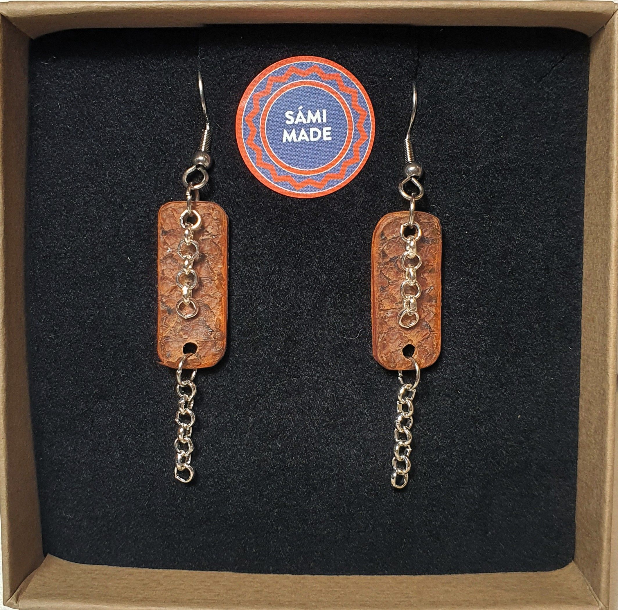 Korvakorut merilohen ja poron nahasta. Metalliosat terästä. Korkeus n 4 cm. Toimitetaan lahjarasiassa.
