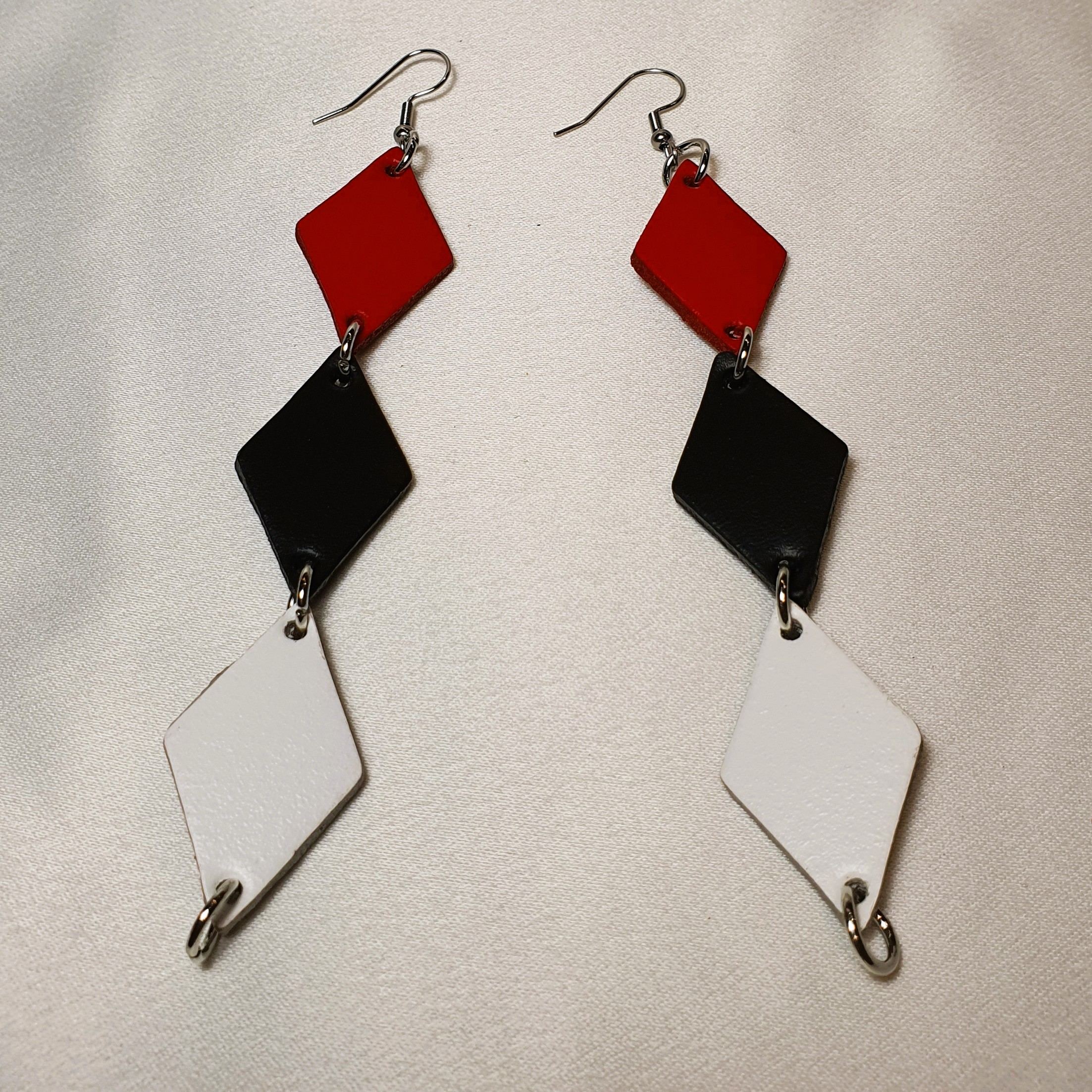 Isot roikkuvat korvakorut. Väri punainen-musta-valkoinen. Naudan nahkaa. Metalliosat terästä. Pituus n. 12cm. Toimitetaan lahjarasiassa.