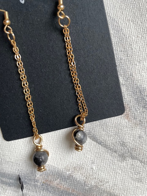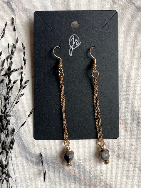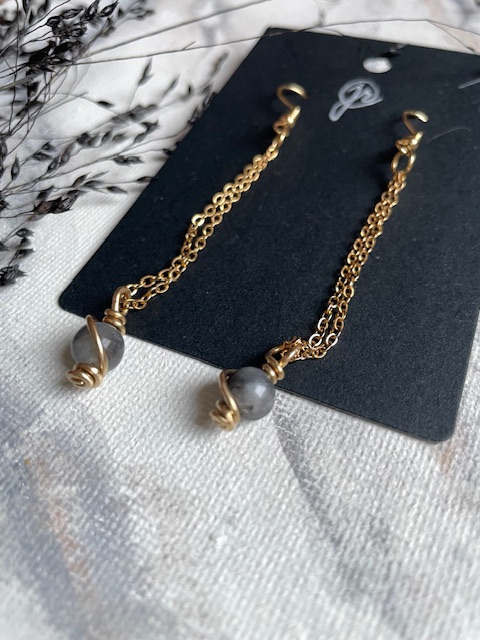 Käsin muotoilluissa riipuksissa on kivenä upeasti hohtavaa labradoriittia. Kaksinkertaisena kullattu ketju tuo näihin korvakoruihin asteen enemmän näyttävyyttä, ketju kimaltelee kauniisti!