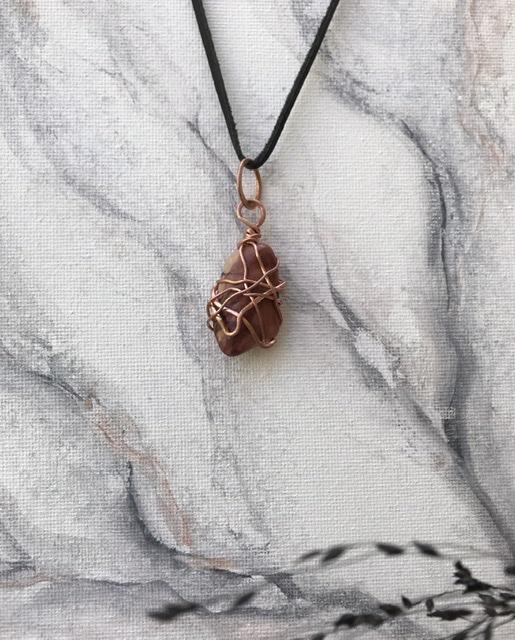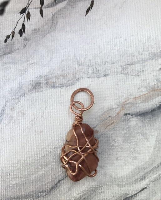 Upean syksyisen sävyinen, riipukseksi kuparilankaan kieputeltu rumpuhiottu jaspis.