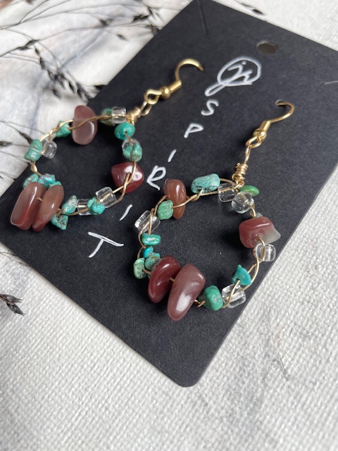 Materiaalit: turkoosi-, akaatti- ja lasihelmet sekä korumessinki. Koukut kullattua RST:tä = ruostumaton / kirurgin teräs, mukana silikonistopparit.