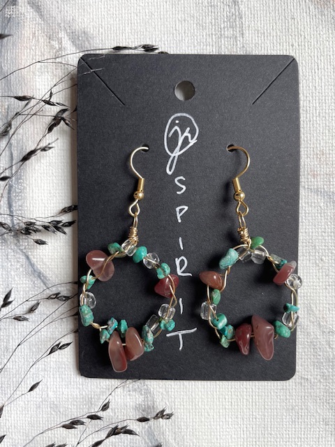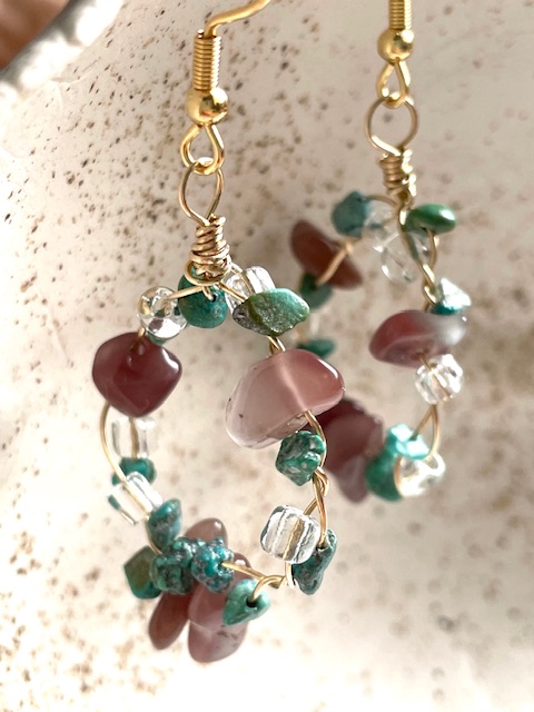 Uniikit, käsin tehdyt korvikset kauniilla lasi- ja kivihelmillä! Mitta: n. 5,5 cm koukkujen kanssa (renkaan halkaisija n. 2,5 cm)