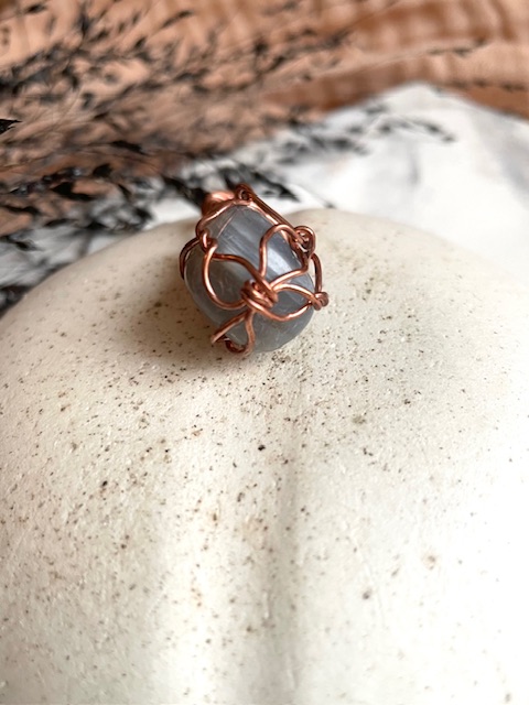 Rauhoittavan sinisen sävyinen, riipukseksi kuparilankaan punottu rumpuhiottu akaatti.