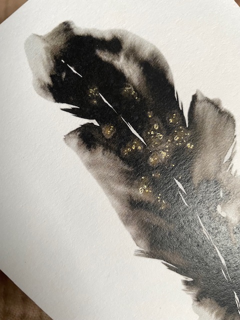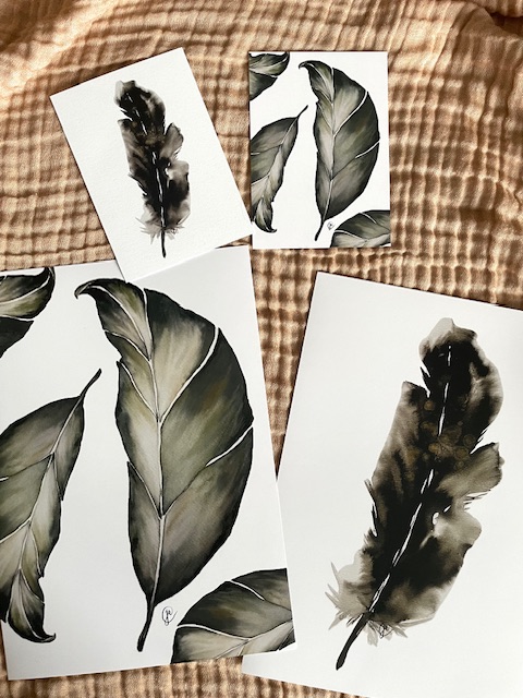 Olen suunnitellut printit omista maalauksistani. Spirit- kortteihin olen vahvistanut kultaisia efektejä geelikynällä. Korttien taustassa on kirjoitusviivat.