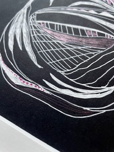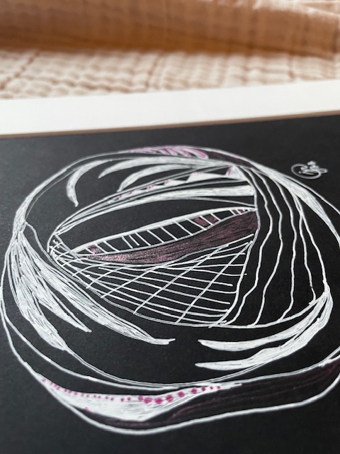 Teos myydään valkoisen aukkopahvin kanssa, helppo sujauttaa valmiskehyksiin. Aukkopahvin kanssa teos mahtuu 21 x 29,7 cm = A4 kokoiseen kehykseen.
