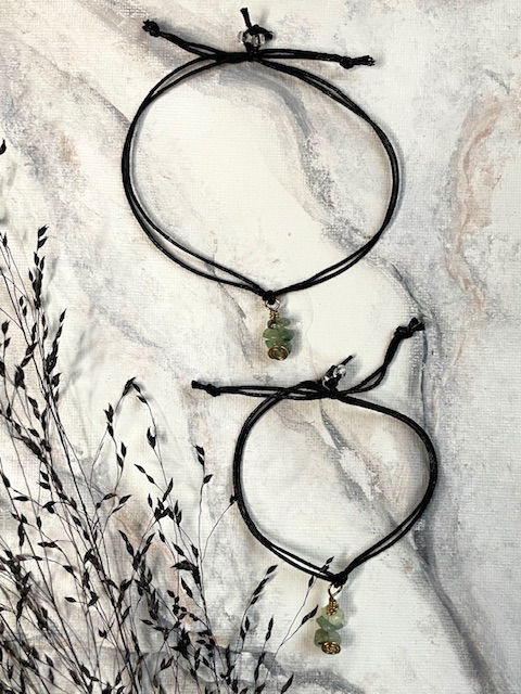 MATERIAALIT JA MITAT: Kivi: prehniitti-siruhelmet Nauha: vahattu puuvilla, musta Muut materiaalit: kirkkaat lasihelmet koristeina säätömekanismissa Riipuksen pituus: n. 1,5-2,5 cm Rannekkeen koko: M-XL (säädettävä, max n. 28 cm) Huomaathan valita tarpeeksi suuren koon, että saat pujotettua korun kämmenesi läpi. Saatavilla myös pienempänä, XS-M -kokoisena max n. 23 cm. Tarvittaessa valmistan korun pienemmässä tai suuremmassa koossa, se onnistuu kyllä! Kirjoitathan siinä tapauksessa sinulle sopivan pituuden kysymyskenttään.