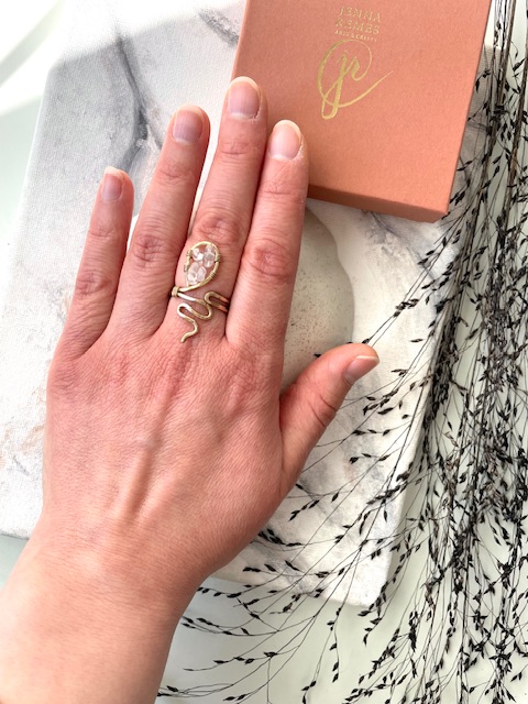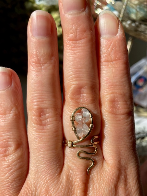 "New Beginnings" Tässä sormuksessa on valoisaa, uuden syntymän energiaa! Käsin muotoiltu uniikki messinkisormus vuorikristalli siruhelmillä.