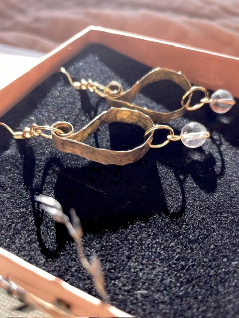 Messingistä muotoillut korvakorut vuorikristalli kivihelmillä. Korvakorujen taottuun messinkilevyyn on piilotettu sanat ”NEVER” ”GIVE UP”; teksti näkyy vain hennosti tietystä kulmasta katsottaessa. Valmisosat ovat kullattua ruostumatonta terästä. Korvikset ovat kauniissa korurasiassa ja mukana tulee messingille soveltuva kiillotustyyny.