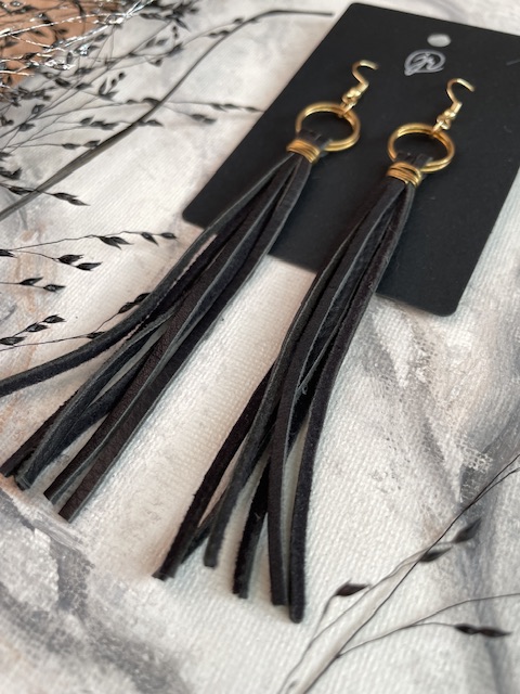 Mitta: n. 12,5 cm koukkujen kanssa Väri: mustaksi värjätty poronnahka