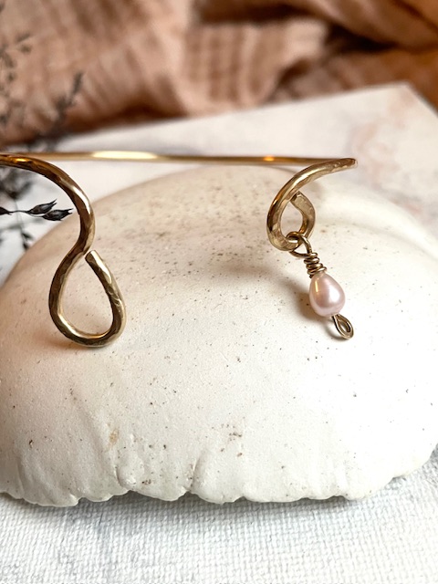 ”Droplets” -rannekoru on käsin muotoiltu rannekoru messingistä (Cu85Zn15). Herkkää persoonallista tyyliä koruun tuo kivihelmistä koottu riipus. Taottu pinta puolestaan antaa korulle persoonallisuutta. Korua voi pitää ranteessa tai hieman ylempänä käsivarressa. Hieman säätövaraa.