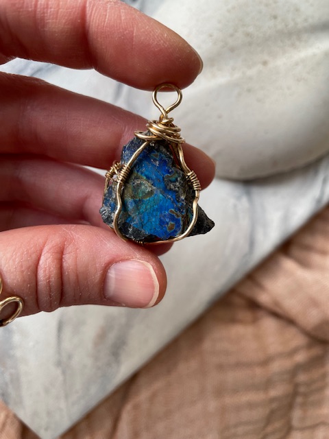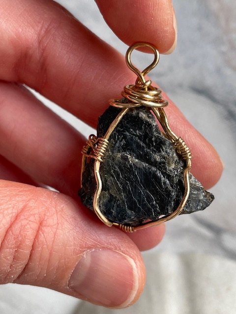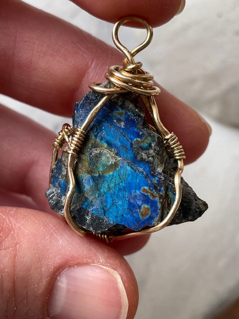 Kivi on punottu riipukseksi messinkilangalla intuitiivisen muotoilun menetelmin.