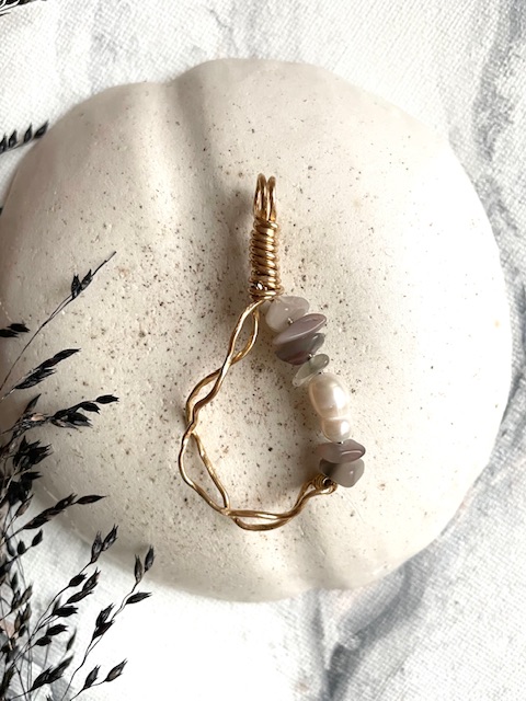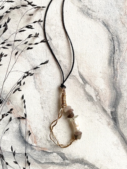 Uniikki, messingistä käsin muotoiltu kaulakoru jossa kivihelminä lilanruskean sävyisiä akaatteja sekä hohtava, valkoinen makeanveden helmi!