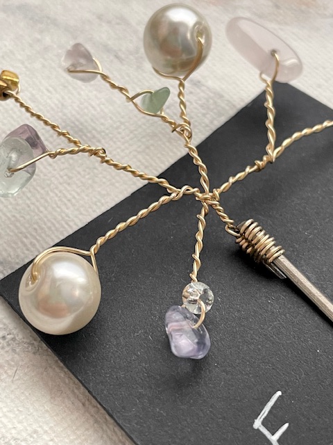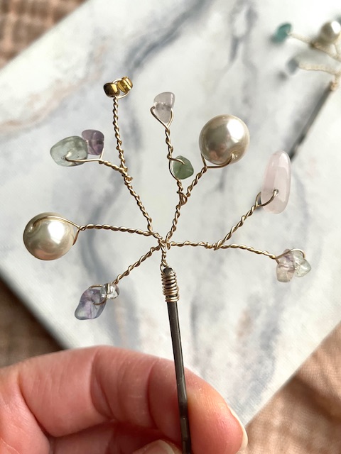 Käsin tehty, uniikki ja näyttävä hiuskoru esim. kampaukseen laitettavaksi! Korun messinkisiä ”oksia” voi varovasti muotoilla haluamaansa muotoon, ethän tee jyrkkiä taitoksia ettei koru mene poikki. Hiuspinni on nikkelivapaa valmisosa.
