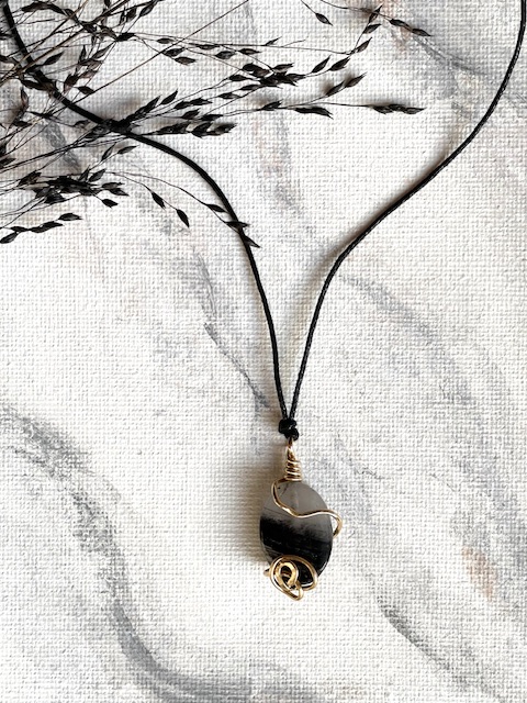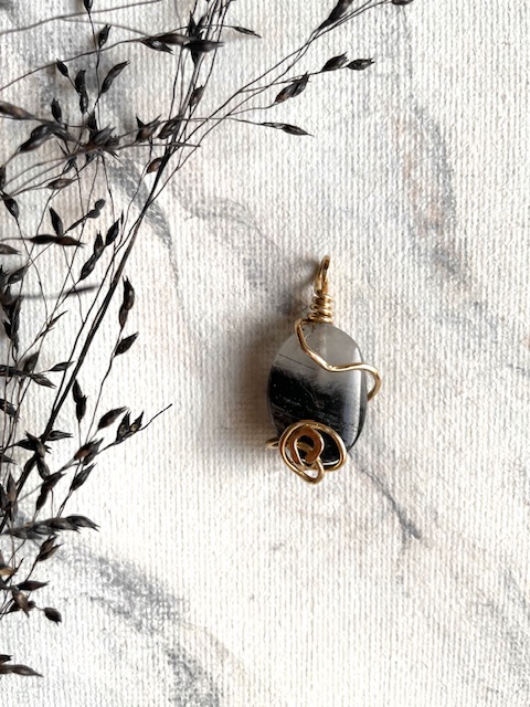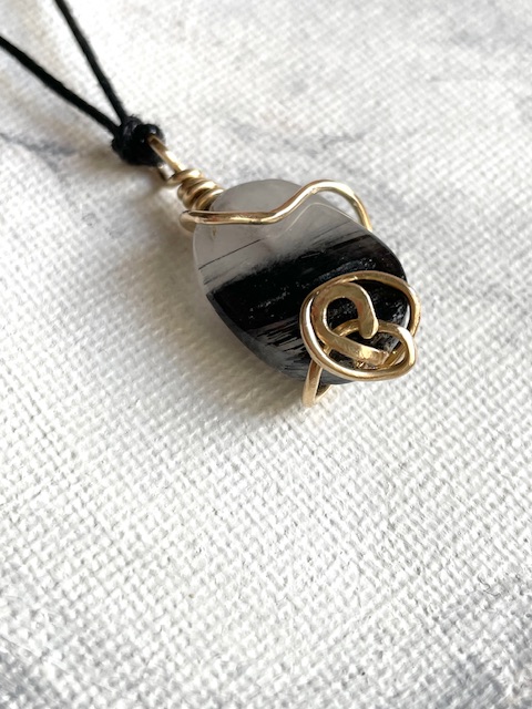 Turmaliinikvartsi -kivihelmestä ja messingistä valmistettu riipus.