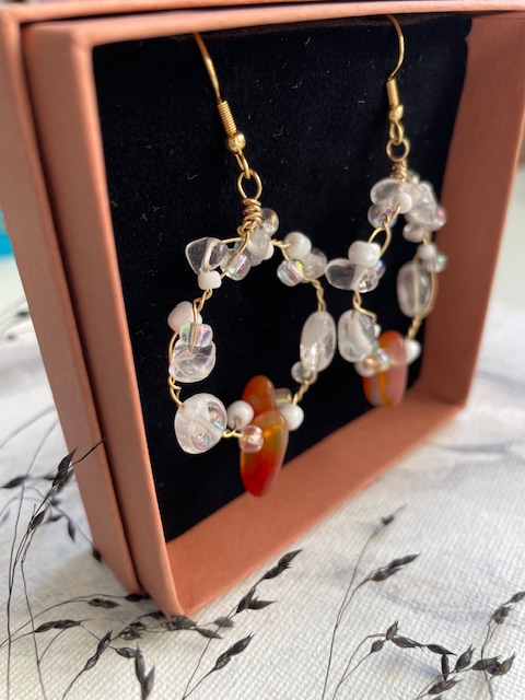 Uniikit, käsin tehdyt rengasmalliset korvikset upean kirkkailla vuorikristalleilla, tulisen oransseilla akaateilla ja lasihelmillä!