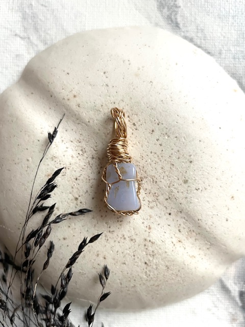 Söpön pieni kiviriipus vaaleansinisestä sinipitsiakaatista. Punottu messinkilankaan. Riipuksen lenkin koko n. 50 mm. Musta puuvillanyöri (n. 80 cm) sisältyy hintaan, voit itse solmia nauhan mieleiselläsi tavalla. Koru tulee kauniissa puuvillapussissa.