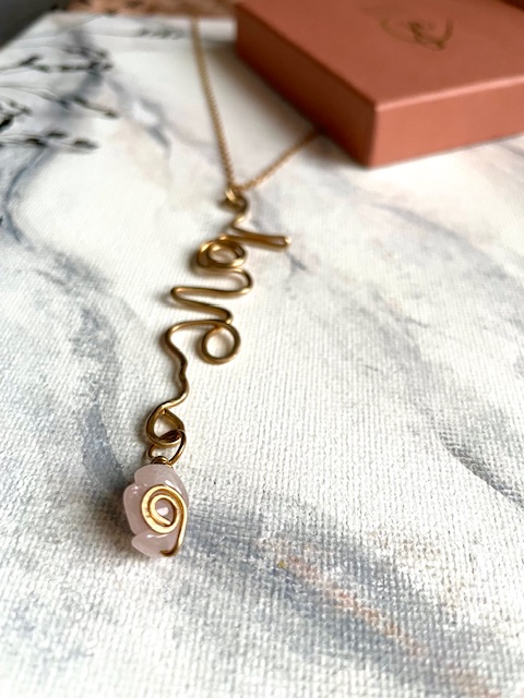 Käsin messingistä muotoiltu uniikki tekstikoru jonka pienessä riipuksessa roikkuu kivihelminä ruusukvartsi-siruja. Valmistan tekstikoruja myös toiveiden mukaan!