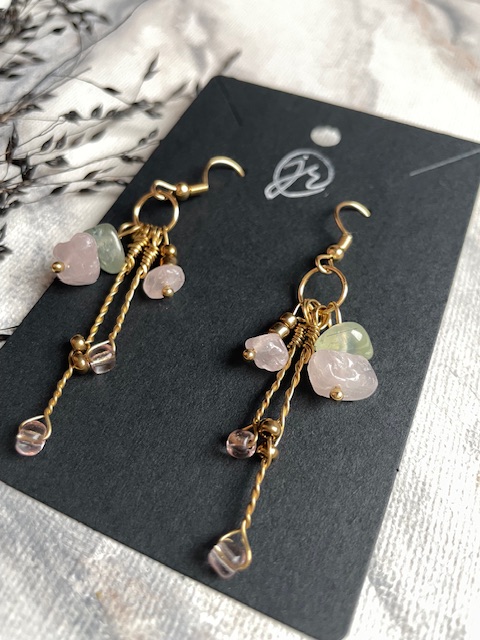 Uniikki korvispari jossa vihertäviä prehniitti-kivisiruja, hempeän vaaleanpunaista ruusukvartis ja pieniä lasihelmiä.