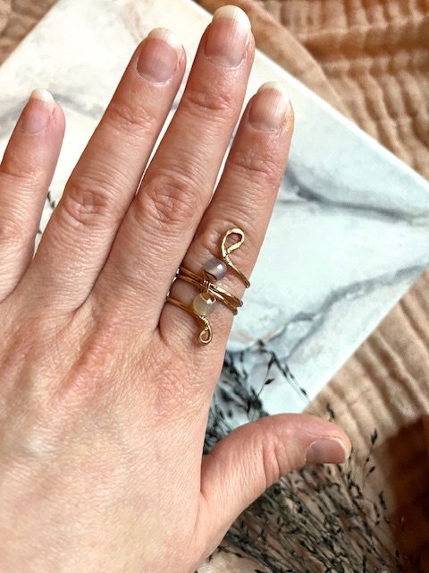 Kaunis kerrossormus maanläheisen sävyisillä Botswanan akaatti-kivihelmillä. Pinta on taottu tuomaan sormukselle omat persoonalliset piirteensä. Ihanan näyttävä ja juhlava sormus arkeen ja juhlaan.
