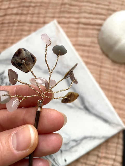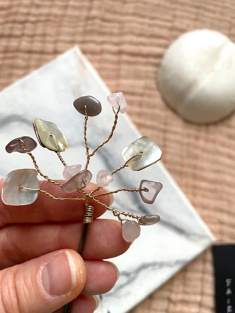 Käsin tehty, uniikki ja näyttävä hiuskoru esim. kampaukseen laitettavaksi! Korun messinkisiä ”oksia” voi varovasti muotoilla haluamaansa muotoon, ethän tee jyrkkiä taitoksia ettei koru mene poikki. Hiuspinni on nikkelivapaa valmisosa.