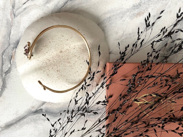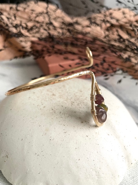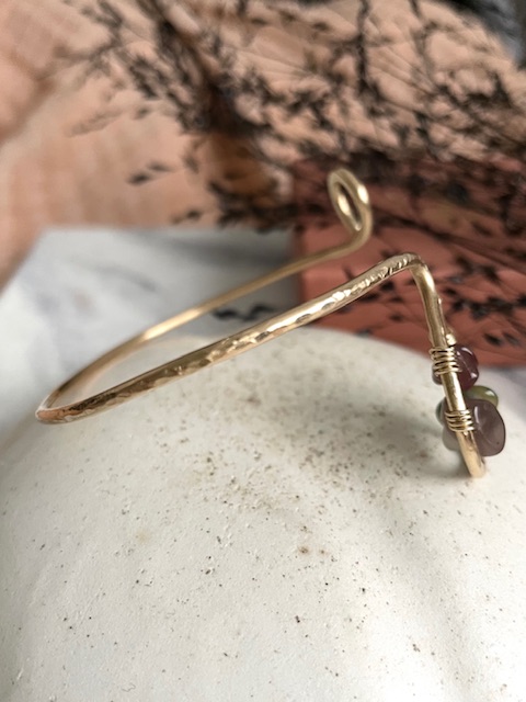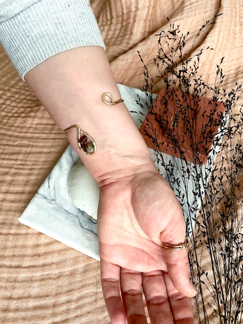 Uniikki, korumessingistä muotoiltu koru jota voi käyttää ranteessa tai ranteen yläpuolella käsivarressa. Akaatti-kivisiruhelmet tuovat koruun maanläheistä, metsäisen rauhallista energiaa.